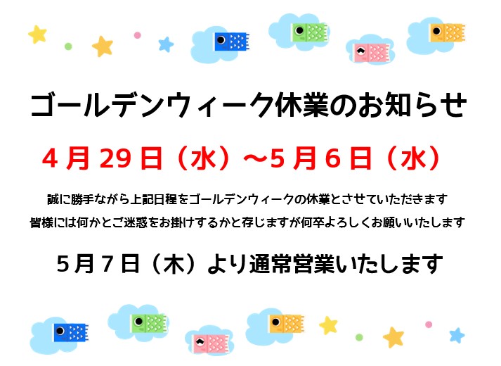 〜ゴールデンウイーク休業のお知らせ〜
